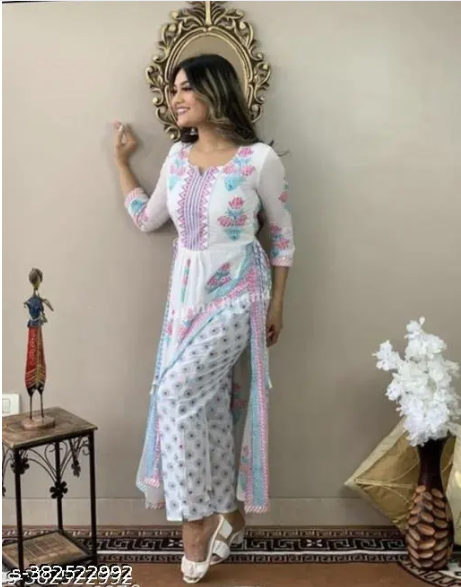 New rayon fabric nayra cut printed kurti with pant. Three quarter sleeves, mandarin neck, below knee length kurti with beautifull prints and printed pant. Fashionable fit for all types of wears for both women and girls. Skin friendly and comfortable fabric